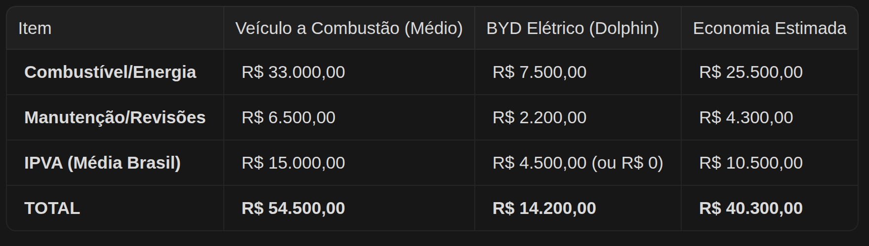 Ao somar a economia em manutenção, o custo significativamente menor com energia e combustível e os benefícios fiscais, a superioridade financeira dos veículos elétricos e híbridos da BYD a longo prazo torna-se inegável. A tabela abaixo ilustra uma estimativa de economia em 5 anos ou 60.000 km rodados, demonstrando que, apesar de um investimento inicial potencialmente maior, a escolha por um BYD elétrico ou híbrido é uma decisão inteligente que se paga ao longo do tempo, contribuindo para um futuro mais verde e para um bolso mais cheio.